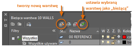 Aby utworzyć nową warstwę, kliknij pokazany przycisk i podaj jej nazwę. Aby ustawić inną warstwę jako bieżącą, kliknij ją, a następnie kliknij wskazany przycisk.