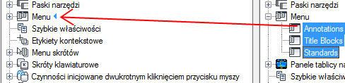 W edytorze Dostosuj interfejs użytkownika (CUI), na karcie Przenoszenie, w lewym panelu kliknij przycisk Otwórz plik adaptacji.