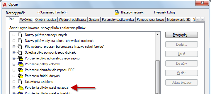 Grupy palet narzędzi są przechowywane w profilu użytkownika. Aby wyświetlić domyślne grupy palet narzędzi, przełącz się do profilu o nazwie <<Profil bez nazwy>> lub <<nazwa produktu — profil bez nazwy>>. (Profile użytkowników nie są dostępne w programie AutoCAD LT).