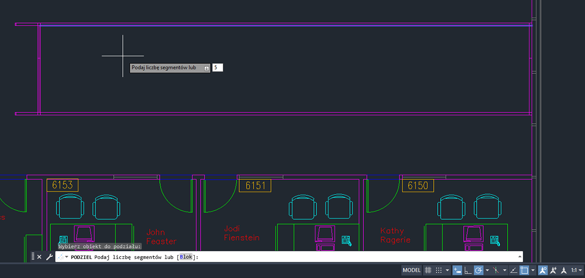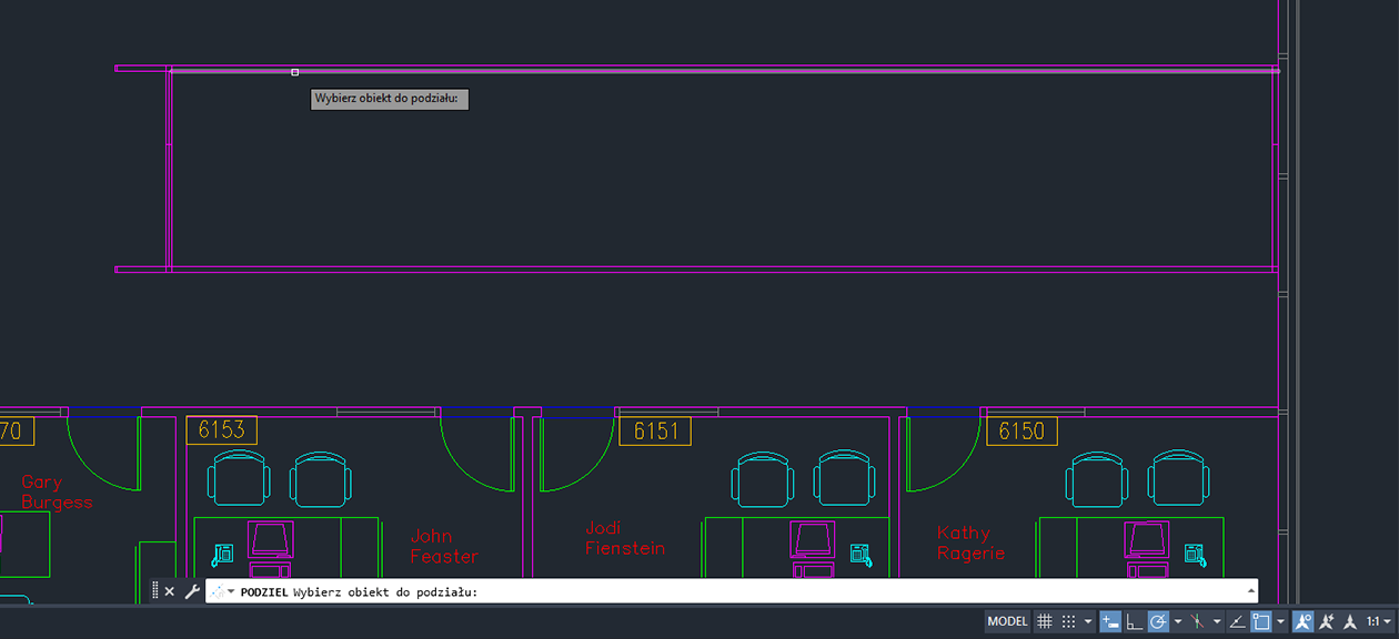 Załóżmy, że chcemy dodać ściany, aby utworzyć między nimi pięć boksów biurowych w pustej przestrzeni. W celu samodzielnego odtworzenia tego ćwiczenia możesz użyć przykładowego rysunku Floor Plan Sample.DWG i usunąć boksy od 6156 do 6162 lub utworzyć nowy rysunek i po prostu narysować prostokąt o podobnym kształcie przedstawiający ściany biurowe.