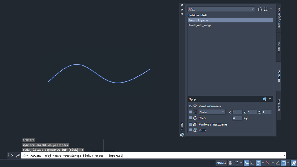 Do tej pory użyliśmy poleceń PODZIEL i ZMIERZ, aby umieścić punkty na obiektach, ale można również użyć opcji Blok, aby umieścić bloki wzdłuż długości lub obwodu obiektu. W poniższym przykładzie użyjemy polecenia PODZIEL, aby równomiernie rozmieścić pięć bloków (w tym przypadku drzew) wzdłuż splajnu.