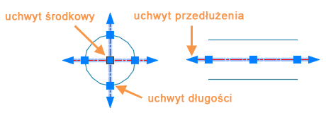 Uchwyty umożliwiają bezpośrednie manipulowanie znacznikami środka i liniami środkowymi. W tym przykładzie linie środkowe były modyfikowane indywidualnie. Przeciąganie uchwytu długości powoduje zmianę długości linii środkowej, a przedłużenie linii środkowej przesuwa się wraz z nią. Przeciągnięcie uchwytu przedłużenia zmienia tylko przedłużenie linii środkowej.