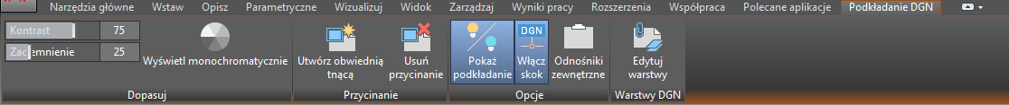 Jeśli w rysunku zostanie wybrane podkładanie DGN, na wstążce zostanie wyświetlona karta kontekstowa podkładania DGN.