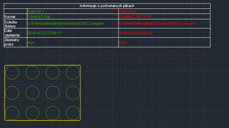 W poniższym przykładowym obrazie przedstawiono informacje dotyczące właściwości dwóch plików rysunków używanych do porównania, wstawionych jako tabela do wynikowego pliku porównania.
