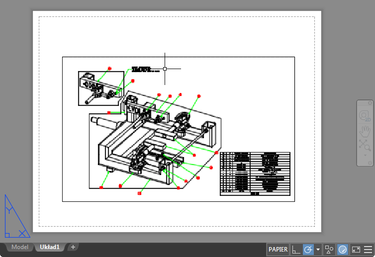 - W celu przygotowania rysunku do drukowania należy przełączyć do obszaru papieru. Można tu skonfigurować różne układy z tabelkami rysunkowymi i uwagami; w każdym układzie należy utworzyć rzutnie układu, które wyświetlają różne widoki obszaru modelu. W rzutniach układu należy określić skalę widoków obszaru modelu względem obszaru papieru. Jedna jednostka w obszarze papieru reprezentuje rzeczywistą odległość na arkuszu papieru, w milimetrach lub calach, w zależności od sposobu skonfigurowania ustawień strony.