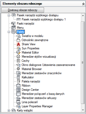 - Na karcie Dostosuj, na panelu Dostosowywane pliki: <nazwa pliku> kliknij znak plusa (+) obok węzła Obszary robocze, aby go rozwinąć.