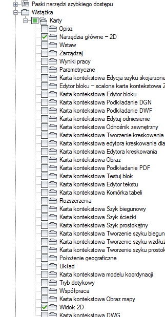 Za pomocą edytora CUI można sterować wyświetlaniem paska narzędzi szybkiego dostępu, kart i paneli wstążki, palet narzędzi, pasków narzędzi i menu rozwijanych.