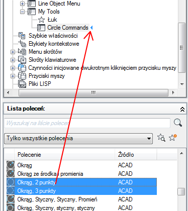 Przeciągnij z panelu Lista poleceń polecenie, które chcesz dodać, do podmenu w panelu Dostosowywane pliki: