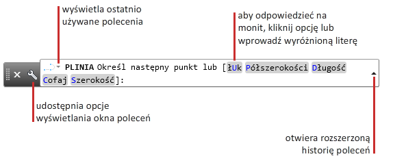 Okno polecenia można dokować oraz zmieniać jego rozmiar. Służy ono do wpisywania poleceń i zmiennych systemowych. Są w nim też wyświetlane monity pomagające wykonać sekwencje poleceń (w tym poleceń zainicjowanych w innym miejscu, na przykład na wstążce).