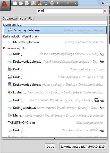 Pole wyszukiwania poleceń jest wyświetlane na górze menu aplikacji. Wyniki wyszukiwania mogą zawierać polecenia menu, podstawowe etykiety narzędzi i ciągi tekstowe wiersza polecenia. Można wprowadzić dowolny wyszukiwany termin w dowolnym języku. Wyniki można zastosować do bieżącego obszaru roboczego.