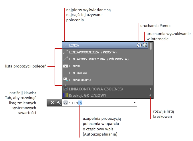 - Lista propozycji zawiera polecenia, które zawierają wpisywane znaki, a także polecenia, które się od nich rozpoczynają.