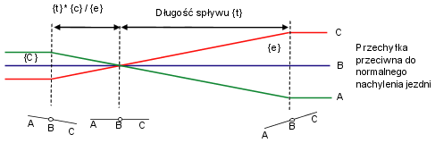 Sekcja Przeciwne definiuje całkowitą długość przejścia, jako długość od poziomowania korony {t}. Odległość do początku łuku jest procentem {t} na podstawie zmiennej {p}, a odległość między pikietą normalnej korony a pikietą korony poziomej wynosi {t} * {c} / {e}.