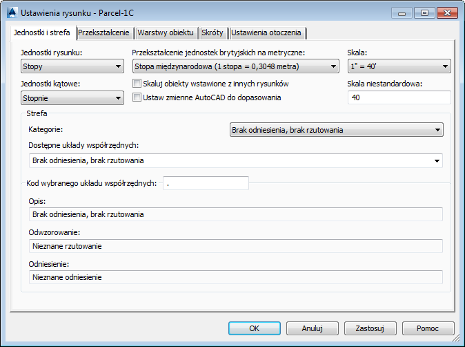 Po wybraniu bazowego szablonu następny logiczny krok to przegląd i odpowiednia korekta ustawień. W oknie Obszar narzędzi na karcie Ustawienia kliknij prawym przyciskiem myszy nazwę rysunku i wybierz polecenie Edytuj ustawienia rysunku. Zostanie wyświetlone okno dialogowe Ustawienia rysunku zawierające pięć kart z wieloma różnymi ustawieniami.