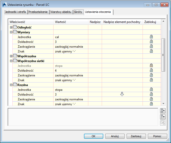 Ustawienia otoczenia skonfigurowane na poziomie rysunku są dostępne na poziomie elementów na liście i można je tam korygować.