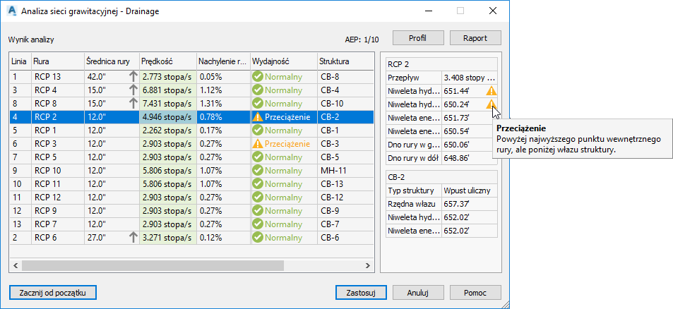 Polecenie Analizuj sieć grawitacyjną umożliwia zmianę średnicy rur i zresetowanie den rur oraz wykonywanie obliczeń niwelet hydraulicznych i energetycznych zgodnie z normami HEC-22.