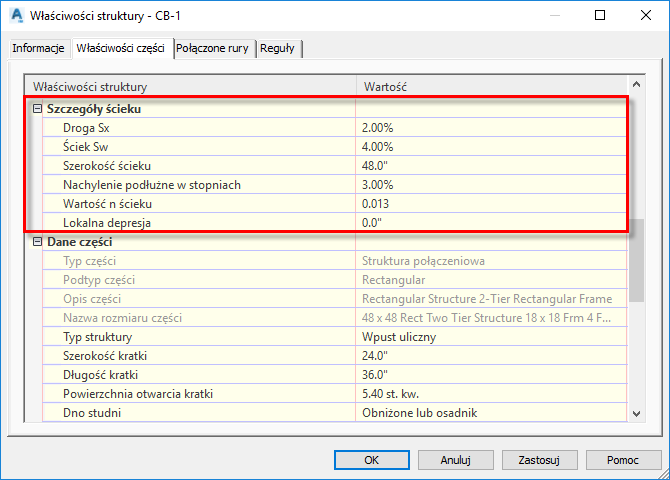 Można użyć sekcji Szczegóły ścieku w oknie dialogowym Właściwości struktury, aby określić właściwości obszaru jezdni wokół wlotu. Właściwości te są używane przez polecenie Analizuj sieć grawitacyjną do obliczeń analizy wlotów.