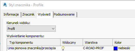 Style znaczników służą do sterowania wyglądem obiektów przecinających w widokach profili. Wyglądem stylu znacznika można sterować na karcie Wyświetlanie okna dialogowego Styl znacznika. Wybierz profil z listy Kierunek widoku, aby przejrzeć i edytować konfigurację stylu znacznika dla widoku profilu. Istnieje pojedynczy komponent, który umożliwia sterowanie wyświetlaniem zarówno znacznika (który służy do wyświetlania przecinających profili, linii charakterystycznych, figur pomiarowych i polilinii 3D), jak i linii pionowej przecięcia (która służy do wyświetlania linii trasowania przecięcia).
