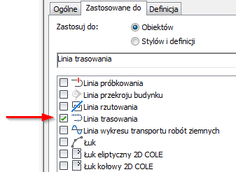 W przypadku większości typów etykiet, na karcie Zastosowane do Menedżera stylów, wybierz typ obiektu, który chcesz opatrzyć etykietą, a nie powiązaną etykietę obiektu (wyjątki opisano poniżej). Przykładowo, aby oznaczyć linie trasowania danymi właściwości, wybierz linię trasowania podczas ustawiania zestawu właściwości.