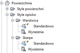Aby rozszerzyć kolekcję i wyświetlić style etykiety dla obiektu, należy kliknąć pole +/-. Niektóre obiekty mają wiele poziomów stylów etykiety.
