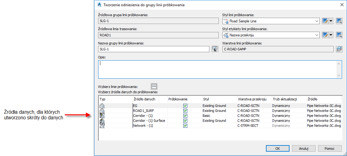 Po wybraniu tych źródeł danych do próbkowania i kliknięciu przycisku OK odniesienia do próbkowanych źródeł są tworzone w obszarze rysunku, jeśli jeszcze nie istnieją. Więcej informacji zawiera temat Informacje o skrótach i odniesieniach do danych grupy linii próbkowania.