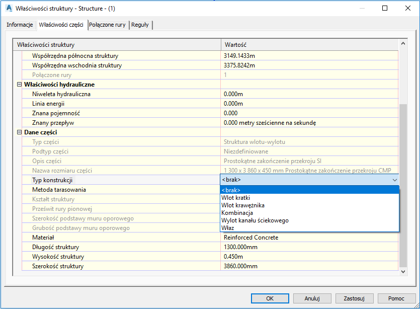 Właściwość Typ struktury steruje również, które inne właściwości są wyświetlane w oknie dialogowym. Przykładowo po wybraniu dowolnego typu wlotu dostępne staną się właściwości Szczegóły ścieku i właściwości wymiarów wlotu.