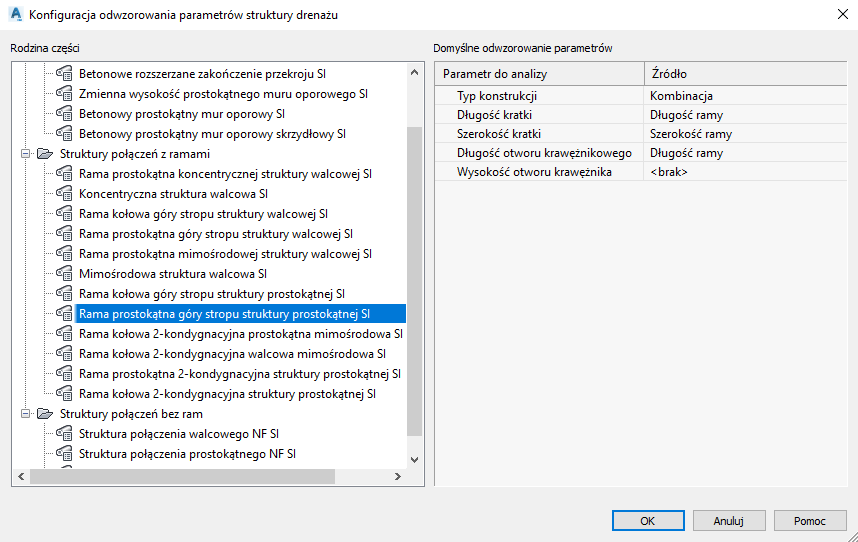 Dzięki skonfigurowaniu i zastosowaniu odwzorowania w przypadku tych części wartości parametrów będą domyślnie dostępne w poleceniu Analizuj sieć grawitacyjną.