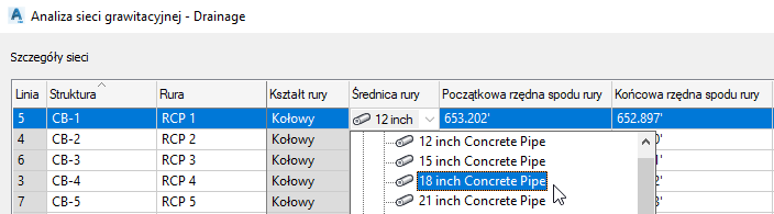 Rury z aktualnej listy części są obecnie wyświetlane i mogą być wybierane ręcznie na stronie Szczegóły sieci z listy rozwijanej.