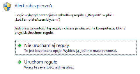 Alert zabezpieczeń jest wyświetlany po uruchomieniu reguły, która w programie Inventor jest wykrywana jako potencjalnie niebezpieczna. Można wybrać uruchomienie reguły jako bezpiecznej lub nieuruchamianie jej. Jeśli wybrano polecenie Uruchom regułę, wyświetlany jest Doradca zabezpieczeń iLogic, w którym można uzyskać dostęp do okna dialogowego Zabezpieczenia iLogic zawierającego dodatkowe opcje zarządzania nieznanym kodem.