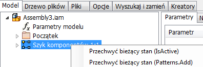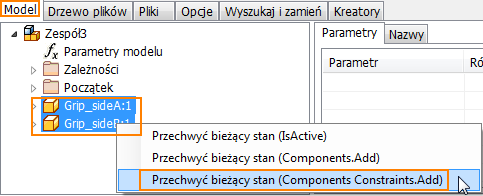 Krok 2 W pliku zespołu, w oknie dialogowym Edycja reguły, na karcie Model dokonaj wielokrotnego wyboru nazw części, kliknij prawym przyciskiem myszy, a następnie z menu kontekstowego wybierz pozycję Capture.Current.State (Components Constraints.Add). |