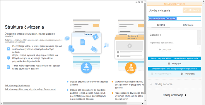 Po kliknięciu przycisku Utwórz ćwiczenie w celu rozpoczęcia procesu opracowywania zostanie wyświetlony podręcznik Struktura ćwiczenia. Kliknij łącza Jak utworzyć na stronie Struktura ćwiczenia, aby obejrzeć dwa krótkie nagrania wideo, które przedstawiają proces tworzenia i udostępniania.