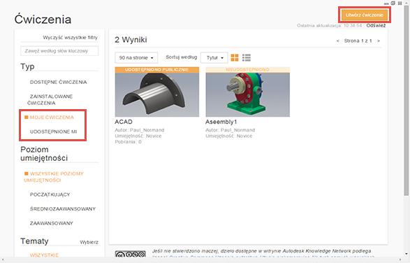 Teraz można tworzyć własne ćwiczenia i udostępniać je prywatnie lub publicznie. To ulepszenie dodaje dwie nowe kategorie do obszaru Typ. Kliknij opcję Moje ćwiczenia, aby wyświetlać ćwiczenia utworzone przez siebie i zarządzać nimi. Kliknij opcję Udostępnione mi, aby wyświetlać ćwiczenia, które zostały Ci udostępnione prywatnie.