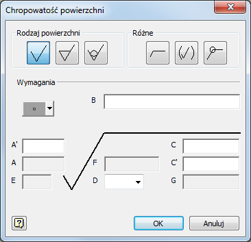 Dostępne są różne układy pól Wymagania. Układ w oknie dialogowym Chropowatość powierzchni odpowiada bieżącemu standardowi rysunkowemu.