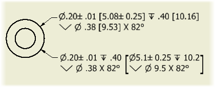 Na poniższej ilustracji pokazano dwa formaty dostępne obecnie w przypadku opisów otworów z podwójnymi wymiarami. Opcja Grupuj razem podwójne wartości jest zaznaczona w przypadku opisu otworu na górze i nie jest zaznaczona w przypadku opisu otworu na dole.