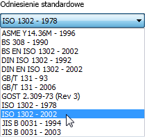 Uaktualniono styl symbolu chropowatości powierzchni, aby zapewnić formaty symboli odpowiadające wielu standardom rysunkowym. Podczas definiowania stylu chropowatości powierzchni należy w oknie Edytor stylów i standardów wybrać odpowiedni standard z listy Odniesienie standardowe.