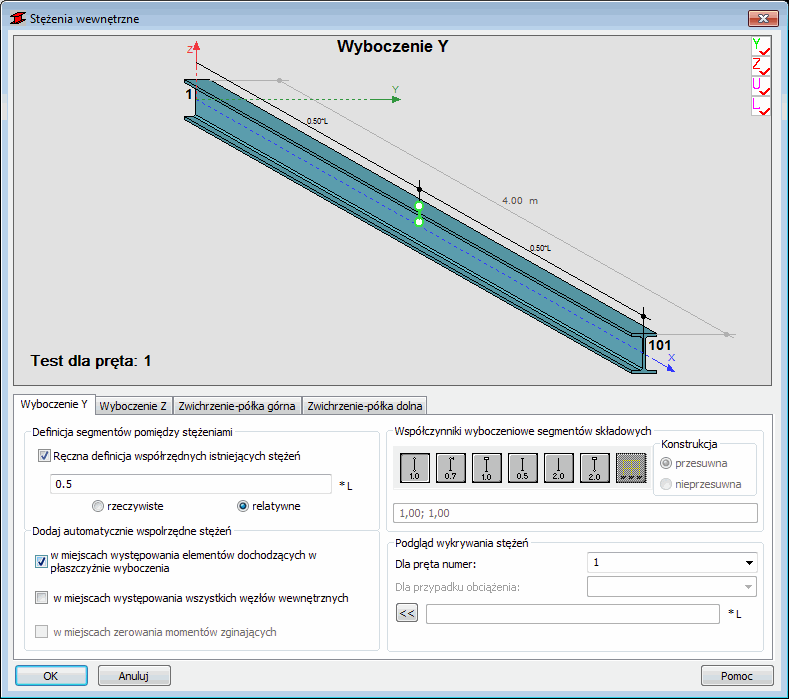 W programie istnieje możliwość zdefiniowania parametrów usztywnień ograniczających zarówno długość wyboczeniową (w obydwu kierunkach), jak i długość zwichrzeniową pręta (osobno dla półki dolnej i górnej). Dzięki temu w trakcie analizy łatwo mogą zostać odczytane zestawy momentów zginających w charakterystycznych punktach pręta. Opcje umożliwiają również zdefiniowanie współczynników długości wyboczeniowej i/lub zwichrzeniowej odcinków pręta między stężeniami.