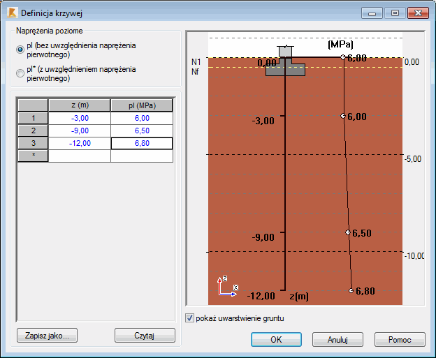 W prawej części okna dialogowego prezentowana jest definiowana krzywa. Włączenie opcji Pokaż uwarstwienie gruntu powoduje prezentację zdefiniowanych warstw gruntu oraz geometrii fundamentu.