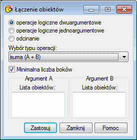 Opcje zawarte w powyższym oknie dialogowym umożliwiają łączenie zdefiniowanych obiektów dwuwymiarowych (powierzchnie rur, prostopadłościanów, łuków itp.) i trójwymiarowych w obiekty złożone. Dla obiektów dwuwymiarowych operacje przeprowadzane będą dla powierzchni, a nie dla obiektów objętościowych (3D).