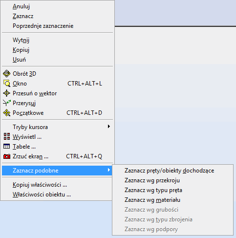 Jeżeli dowolny obiekt został podświetlony (ale nie wybrany) na widoku konstrukcji, to w menu kontekstowym dodanych jest kilka opcji w stosunku do standardowej zawartości menu kontekstowego.