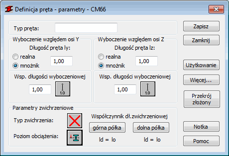 W polu typ pręta podawana jest nazwa wybranego typu pręta (można wpisać w tym polu nazwę tego typu pręta). W polach Wyboczenie względem osi Y lub Z wprowadzona może zostać długość pręta dla odpowiedniej płaszczyzny.