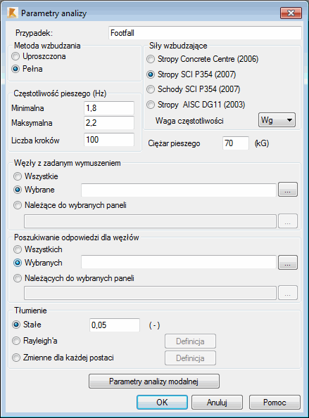 Okno dialogowe Parametry analizy Footfall służy do definiowania parametrów analizy dynamicznego wymuszenia spowodowanego poruszaniem się ludzi dla przypadku obciążenia zdefiniowanego dla konstrukcji.