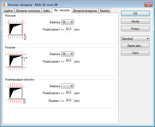 Na karcie Zbrojenie otworów można zdefiniować parametry zbrojenia otworów dla normy BAEL.