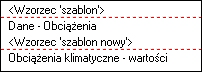 Przypisuje szablony strony zapisane w oknie dialogowym Ustawienia strony do kolejnych elementów wydruku. Po wybraniu szablonu nazwy w menu kontekstowym, jest ona umieszczona przed rozpoczęciem wydruku elementów, które mają być wydrukowane. W poniższym przykładzie wczytywania danych szablon zostanie wydrukowany przy użyciu „szablonu”, natomiast wartości obciążenia powodowanego przez śnieg/wiatr zostaną wydrukowane przy użyciu szablonu o nazwie „nowy szablon”.