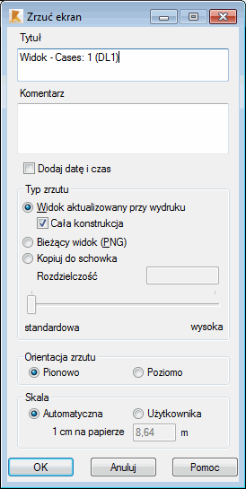 Prawy panel zawiera komponowany przez użytkownika wydruk całościowy z dostępnych w lewym panelu obiektów. Dodanie do wydruku zdefiniowanych zrzutów ekranu jest możliwe poprzez naciśnięcie przycisków Wszystko i Dodaj. Naciśnięcie przycisku Wszystko powoduje przeniesienie całej zawartości lewego panelu do panelu prawego; naciśnięcie przycisku Dodaj powoduje dodanie do wydruku jedynie obiektu podświetlonego w lewym panelu.
