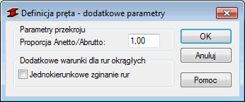 Opcja służy do określenia dodatkowych parametrów normowych typu pręta stalowego. Jest dostępna po naciśnięciu przycisku Więcej znajdującego się w oknie dialogowym Definicja pręta — parametry.