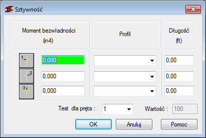 Po wybraniu numeru pręta dochodzącego w dolnej części okna dialogowego sprawdzana jest wartość współczynnika wyboczeniowego, a w polu Test dla pręta: Wartość podawana jest wartość wyznaczonego przez program współczynnika wyboczenia.