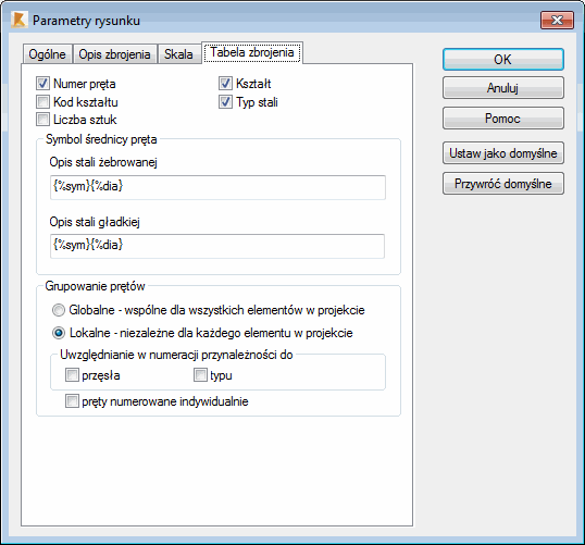 Wybierz opcje Analiza > Rysunek lub otwórz okno (Parametry rysunku) a następnie wybierz kartę Tabela zbrojenia.