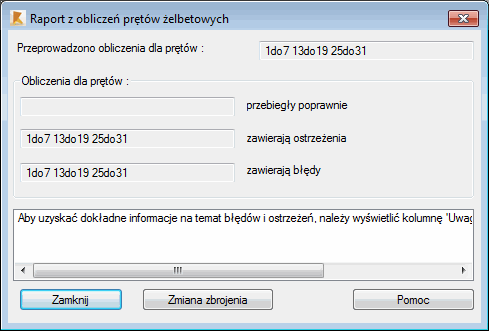 Jeżeli wystąpiły błędy lub ostrzeżenia w trakcie obliczeń prętów żelbetowych, to w dolnej części okna dialogowego pojawia się komunikat informujący użytkownika, w jaki sposób można uzyskać informacje na temat występujących błędów lub ostrzeżeń.