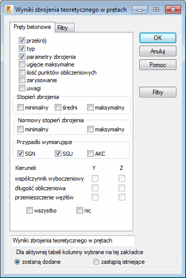 W powyższym oknie dialogowym wybrane mogą zostać następujące wielkości, które będą prezentowane w tabeli wyników zbrojenia teoretycznego (wymaganego) dla prętów konstrukcji: