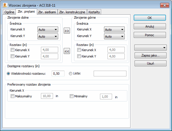 W polach Średnica wymuszone może zostać stosowanie tylko jednej średnicy w danym kierunku. Wybranie opcji Auto powoduje wybór jednej ze średnic z listy dostępnych średnic. Ustawienie jest niezależne dla każdego z kierunków oraz każdej z warstw zbrojenia.