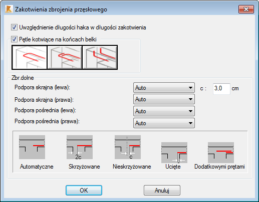 Dzięki niej użytkownik określa, w jaki sposób ma być zakotwione zbrojenie przęsłowe dochodzące do podpór. Realizacja zakotwienia może być różna w zależności od rodzaju podpory z rozróżnieniem na podpory skrajne i pośrednie oraz lewe i prawe rozpatrywanego przęsła. Opcja Auto (Automatyczne) dobiera taką długość pręta w obszarze podpory, aby były spełnione warunki zakotwienia zbrojenia. Pozostałe trzy opcje zakotwienia: Skrzyżowane, Nieskrzyżowane i Ucięte działają na zasadzie wymuszenia obcięcia (zakończenie pręta w obszarze podpory jest wartością zależną od otuliny „c”). W przypadku wyboru jednej z tych trzech opcji oraz niewystarczającej długości zakotwienia, program ostrzega użytkownika stosownym komunikatem. Parametr c, który można zdefiniować w górnej części okna dialogowego Zakotwienia zbrojenia przęsłowego, pozwala na sterowanie długością zakotwień w przypadku wyboru jednego z wymienionych typów zakotwienia: Skrzyżowane, Nieskrzyżowane i Ucięte. W przypadku wybrania opcji Dodatkowymi prętami zbrojenie jest dopasowywane do kolejnych przęseł w taki sposób, że nie koliduje ze zbrojeniem słupów, a następnie jest przenoszone nad podporami za pomocą dodatkowych prętów.